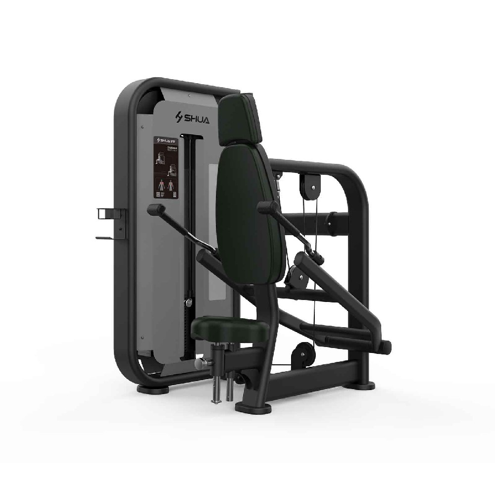 主要功能 锻炼肱三头肌1、阻力形式:配重块;总重90kg;最小调节重量5kg2、垫类(坐/背/胸/肘垫):坐垫高度可调节;PU发泡成型3、最大人体承重:150kg4、主要管材规格:龙门架平椭150502.0mm,副架平椭120502.0mm5、牵索形式:日本进口钢丝绳;¢5.6mm6、轴承:人本轴承;62057、滑轮:尼龙加纤;¢117mm8、皮革类